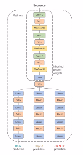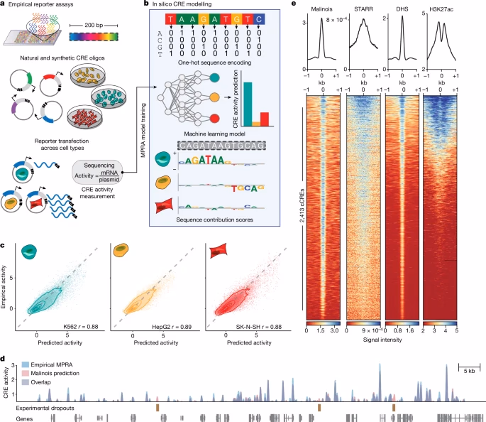 MPRAを使って776,474の200bpのCREsの活性を3種のCell type; K562 (erythroid precursors), HepG2 (hepatocytes) and SK-N-SH (neuroblastoma) で実験的に確認し、その結果を教師として、配列から3つのCell typeの活性を予測するCNNベースのモデル Malinois を構築している。その結果は、相関 (Fig. 1c) や実際のMPRAの発現とのoverlap (Fig. 1d)、その他epigenetic baseの手法; STARR-seq (enhancer)、DHS (DNase I hypersensitive sites)、H3K27ac (active histon mark)との比較 (Fig. 1e) を見ると、だいたい正しく予測できてそう、というのがわかる。