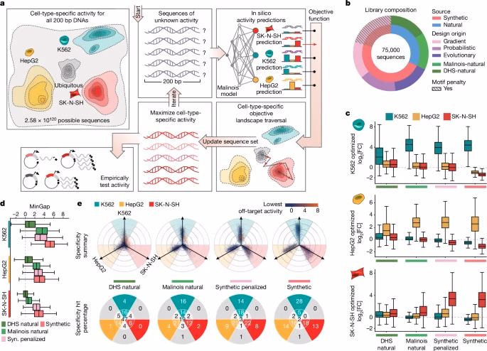 この論文は、機械学習を用いて細胞型特異的なCis-reguratory elements(CREs)を設計し最適化する新しい方法を提案している。研究者らは、Massively Parallele Reporter assay(MPRA)データを使用してCNNベースのモデル「Malinois」を訓練し、このモデルを用いて細胞型特異的なCREsを予測した。さらに、配列最適化フレームワーク「CODA」を開発し、in vitroおよびin vivo実験でその有効性を実証した。