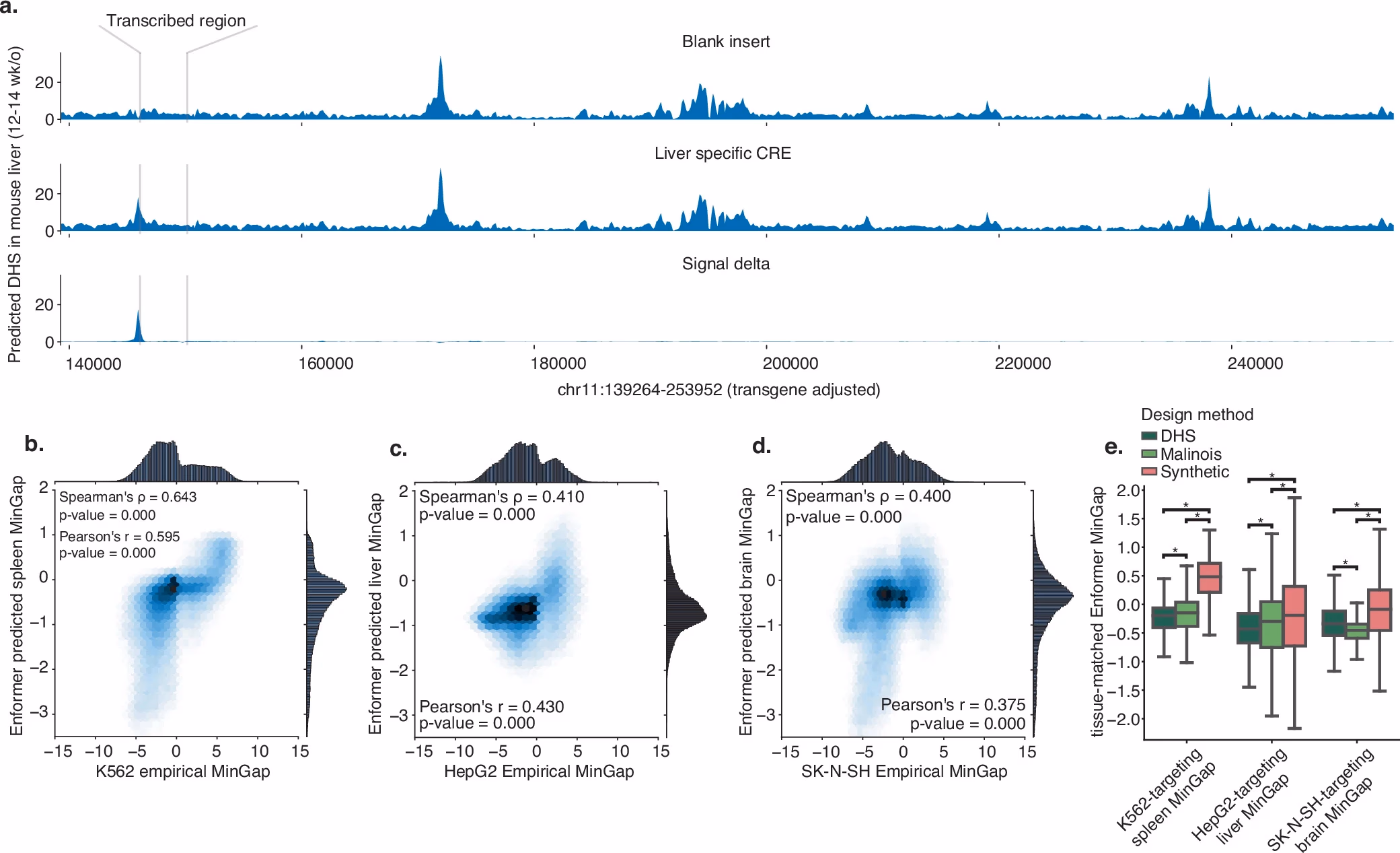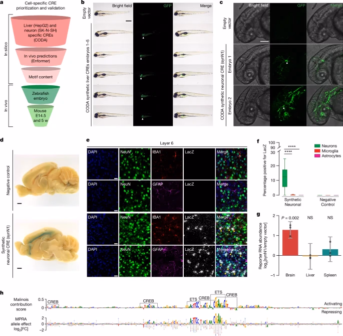 In vivoでの活性を確認するため、まずはEnformerで発現量、epigeneticな状態の予測を行った。その結果、MinGapのスコアは、それぞれK562 → spleen (脾臓)、HepG2 → Liver、SK-N-SH → brainと相関していた (Extended Data Fig. 8)。この結果を実際にZebrafishとMouseで確認すると、それぞれ特異的な発現パターンを示した (Fig. 4)
