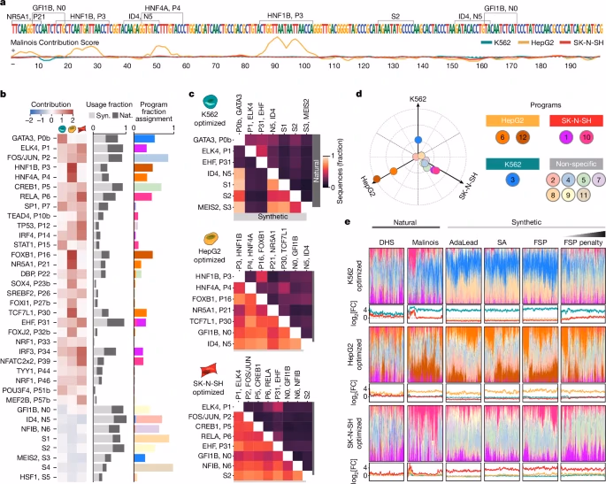 36個既知のTFのモチーフがあって、28個がactivation、8個がrepressionだった。基本的には既知の研究でそのCelltypeで重要な役割を果たすTFのものであった。これらのモチーフは、Syn配列でもNatural配列でも少なくとも1回は使われていたが、使用される頻度が異なる (Fig. 3b)。Syn配列では、より多くのモチーフがCREsに含まれていて、Syn. Penalized配列では、non-redunduntなモチーフ構成になっていた。