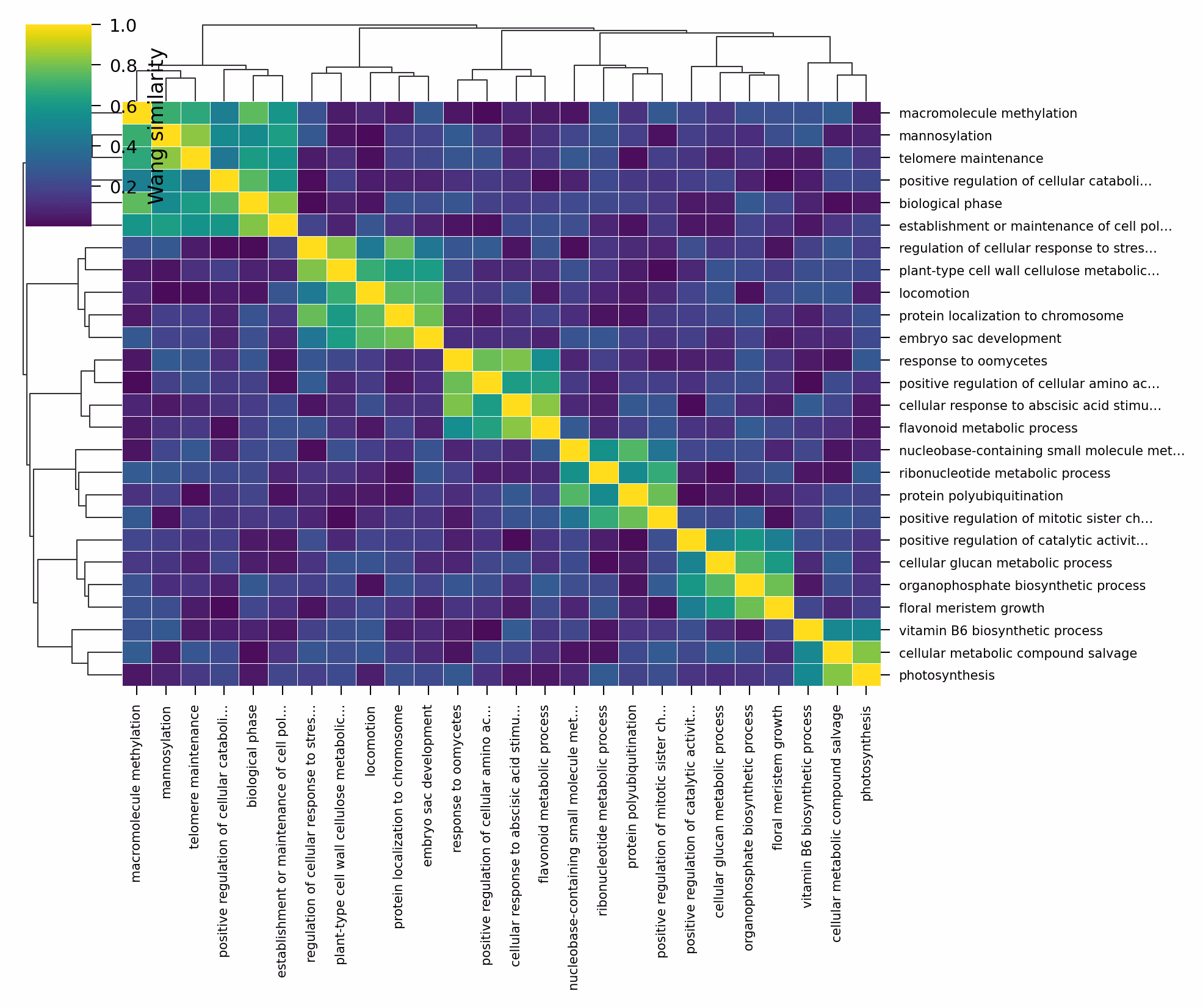 Similarity matrixをヒートマップとして可視化します。seabornのclustermapを使うと、階層クラスタリングの樹形図(デンドログラム)も同時に表示できるので、GO Term間の関係が直感的にわかります。