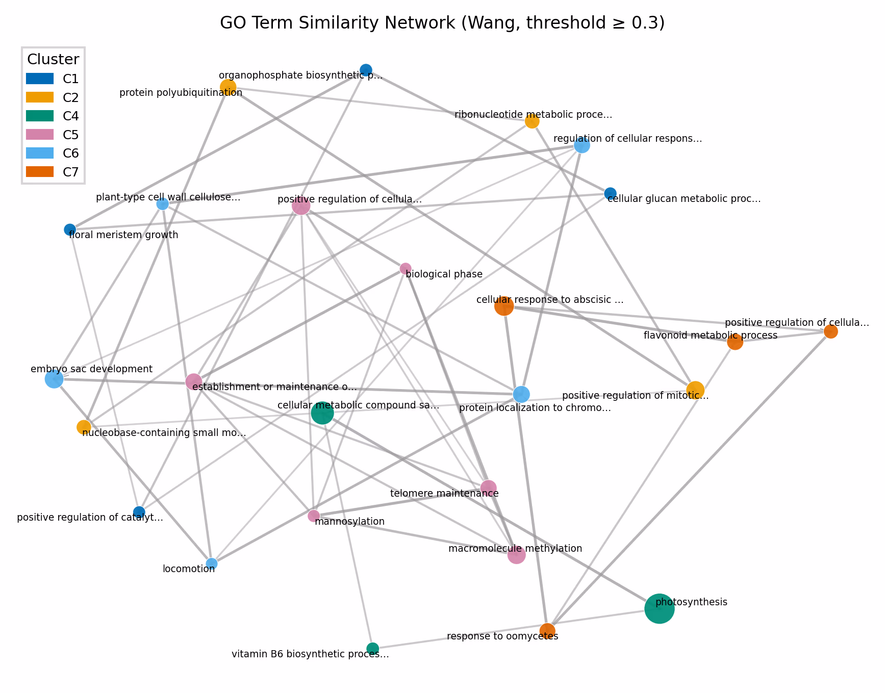 networkxを使って、GO Term間のsimilarityをネットワークとして可視化することもできます。ノードがGO Term、エッジがsimilarityを表し、類似度が閾値以上のペアのみをエッジとして描画します。ネットワークレイアウトはspring layout(force-directed)を使い、類似度が高いノード同士が近くに配置されます。