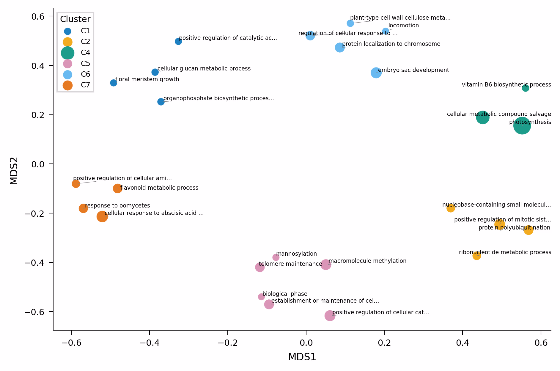 MDSの代わりにUMAPを使うこともできます。特にGO Termの数が多い場合はUMAPのほうが適切な場合があります。